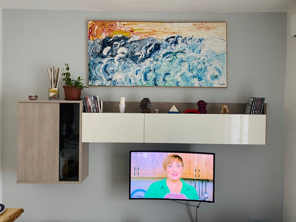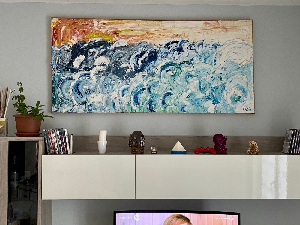 Questa casa moderna si trova a La Spezia, il quadro con le “casette colorate” tipicamente liguri sono dipinte con acrilico su assi di pellet, che io stessa ho tagliato e unito. La tela orizzontale con il mare di 2 metri per uno circa è realizzata con stucco francese, vinavil e colore acrilico, steso grazie a una spatola da pasticceria. Ricordo bene quel giorno a Monterosso e l’orizzonte rosso fuoco.