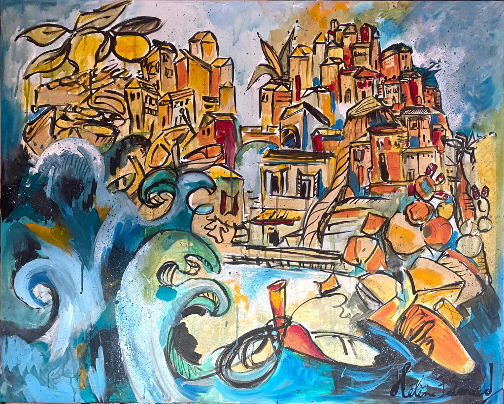 Bisognerebbe imparare dallo scirocco a scuotere il mare, con il suo dolce tepore mi parla di paesi lontani, potessi con i miei colori ricambiare e raggiungerli, se dal mio dipinto fuoriuscissero fasci di luci brillanti, attraversassero ogni finestra, volteggiassero nell’aria in proiezioni astrali, in un’aurora boreale, convogliassero dopo il deserto in un’unica direzione con destinazione, il petto. Al suo passaggio come pranoterapia guarisca corpi anestetizzati da cieli di nebbia e smog, infezioni da smania e brama di soldi.